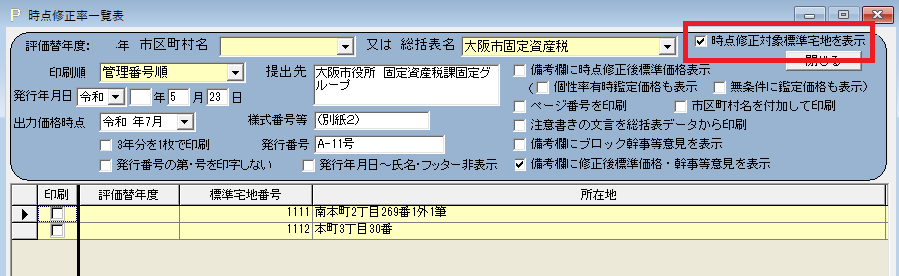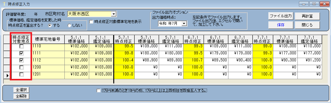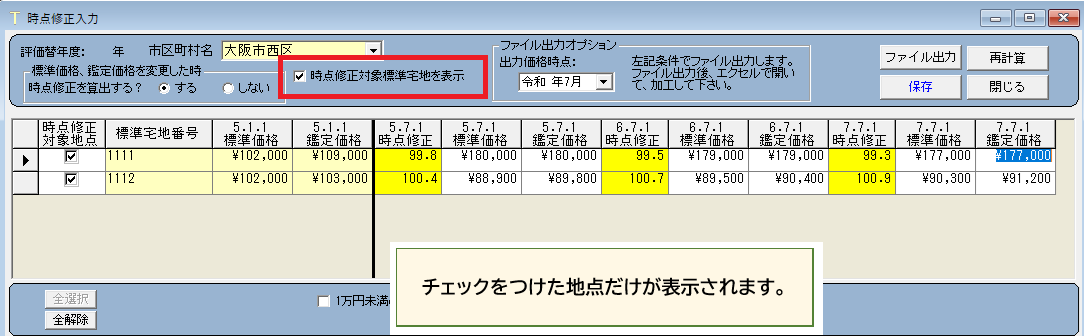 時点修正 市町村の一部の地点のみを入力、印刷したい 2024年02月25日 最終更新日時 : 2024年05月27日 ops-inc 時点修正 市町村の一部の地点のみを入力、印刷したい 時点修正の対象地点を絞り込めます。 入力 [メインメニュー]-[40.時点修正一覧表]-[時点修正入力]をひらきます。 市町村を選択し、時点修正の対象地点を選択します。 画面上部のオプション[時点修正対象地点を表示]にチェックをつけると、絞り込めます。 印刷 [メインメニュー]-[40.時点修正一覧表]-[時点修正一覧表の印刷]をひらき、画面上部のオプションにチェックをつけて印刷してください。 時点修正一覧表 印刷画面 以上 Post Views: 70