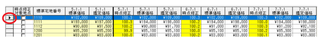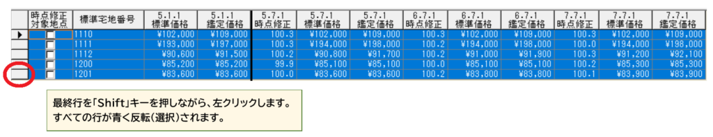 時点修正 計算設定を変更したが価格が変わらない 2024年02月26日 最終更新日時 : 2024年05月28日 ops-inc 時点修正の計算設定を変更したが、価格が変わらない 再計算の操作が必要です。 時点修正の入力画面を開きます。 1件目の地点を選択します。1行青く反転します。 最後のデータの一番左端のグレー部分を、Shiftキーを押しながらクリックします。全データが青く反転します。 再計算ボタンをクリックします。 以上 Post Views: 64