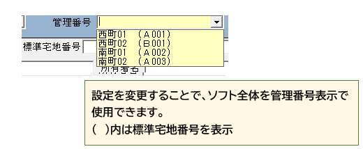 [メインメニュー]-[1.環境設定]-[基本設定]タブにある[標準宅地番号コンボボックスの表示方法]を「管理番号」に変更します。