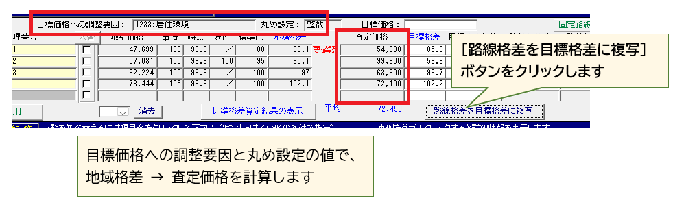 固定路線価入力画面 - 路線価格差が計算されます。[路線価格差を目標格差に複写]ボタンをクリック → 調整要因と丸め設定の値で査定価格を計算します。