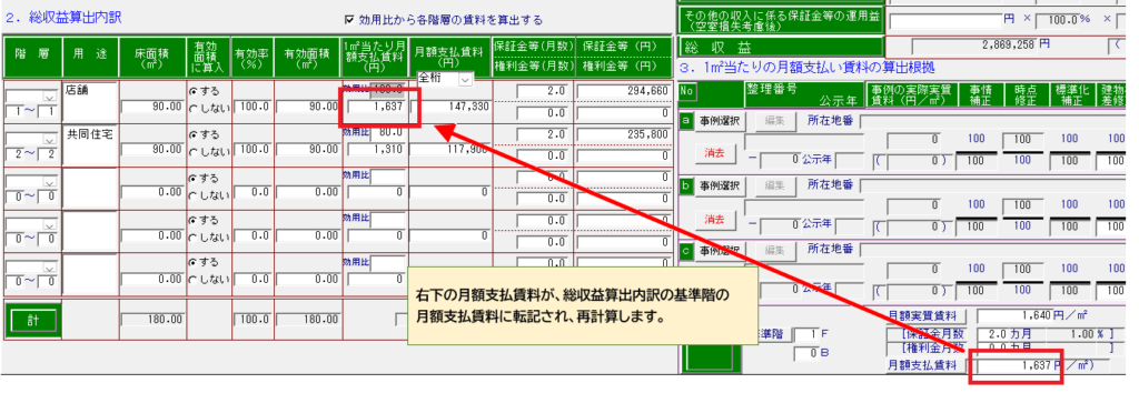 - 総収益算出内訳 基準階に月額支払賃料を転記し再計算します。