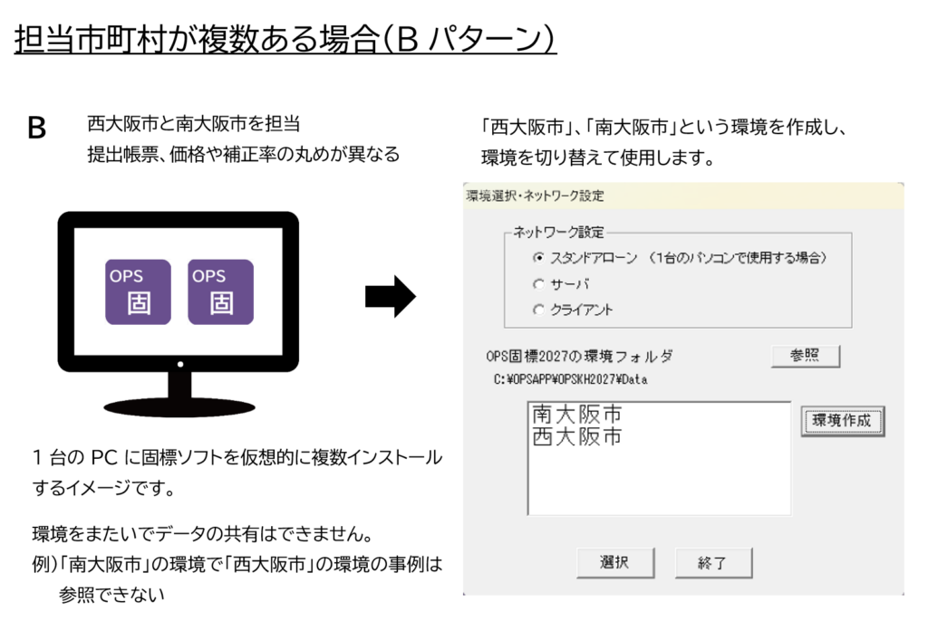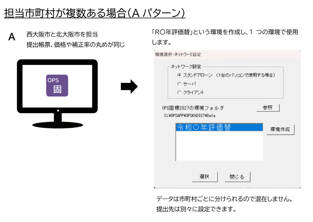 価格の丸めや提出帳票が同じでも、市町村ごとに環境をわける(Bパターンで使用する)ことも可能です。