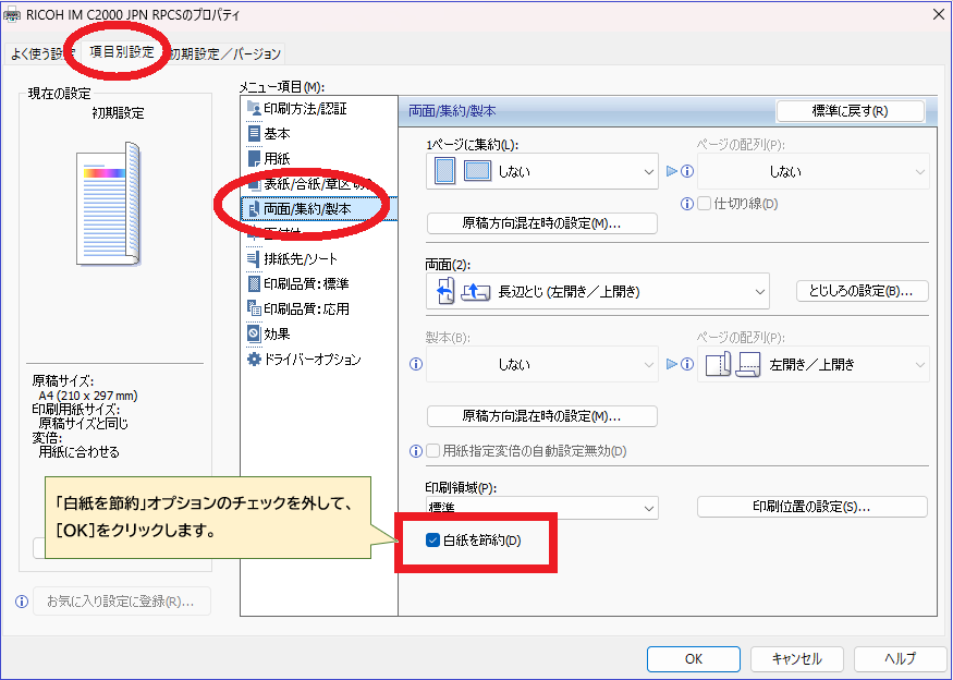 - 白紙節約のオプションを解除します。プリンタ:RICOH IM C2000の場合は、[項目別設定]タブ → [両面/集約/製本]メニューにあります。