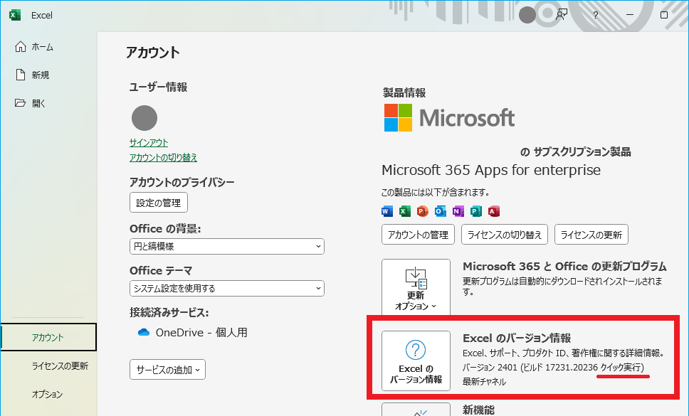 Excelのバージョン情報で確認する