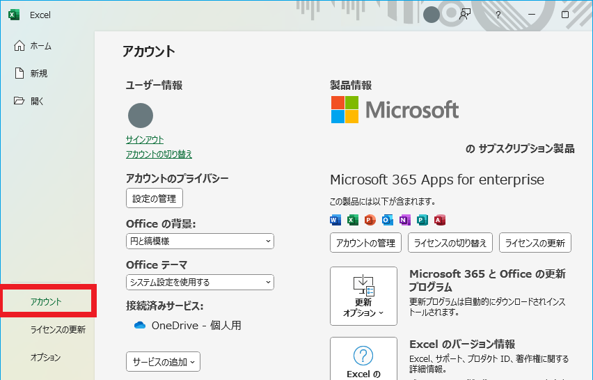 Microsoft Excelを起動し、アカウント を選択する